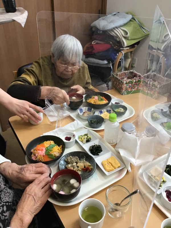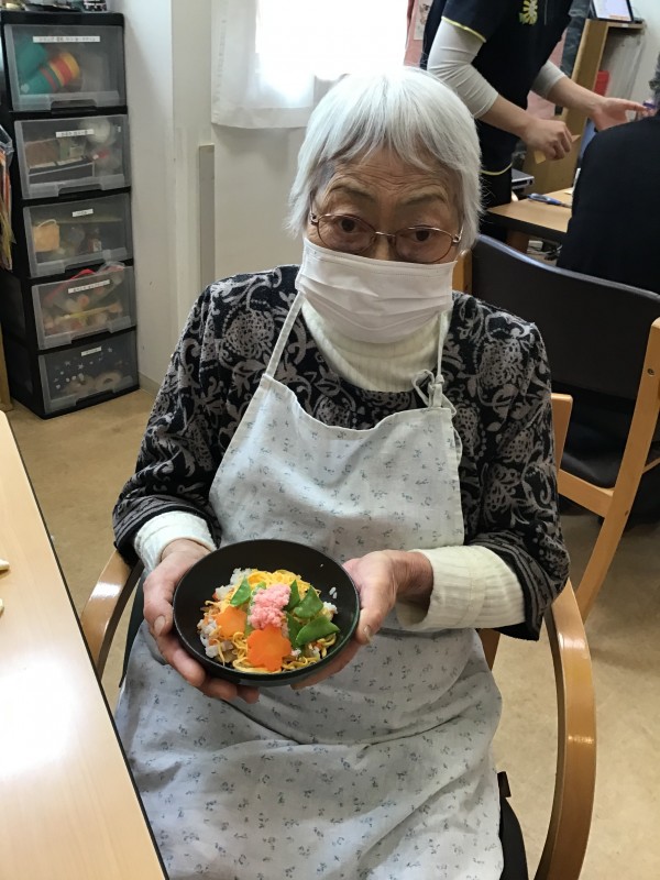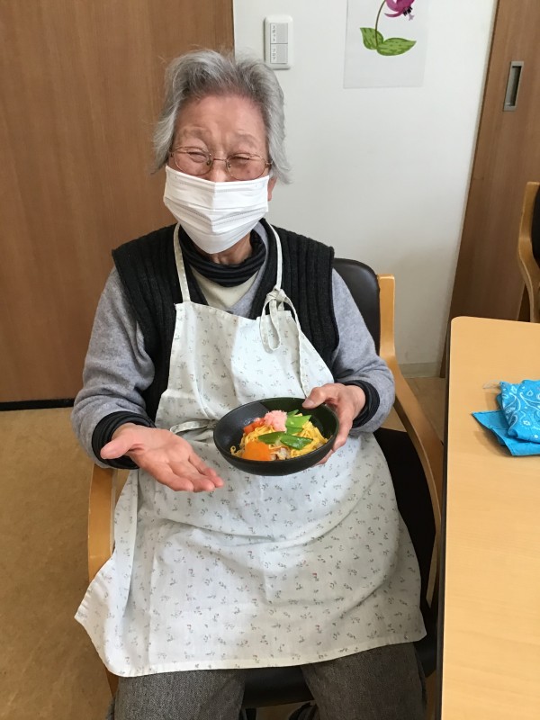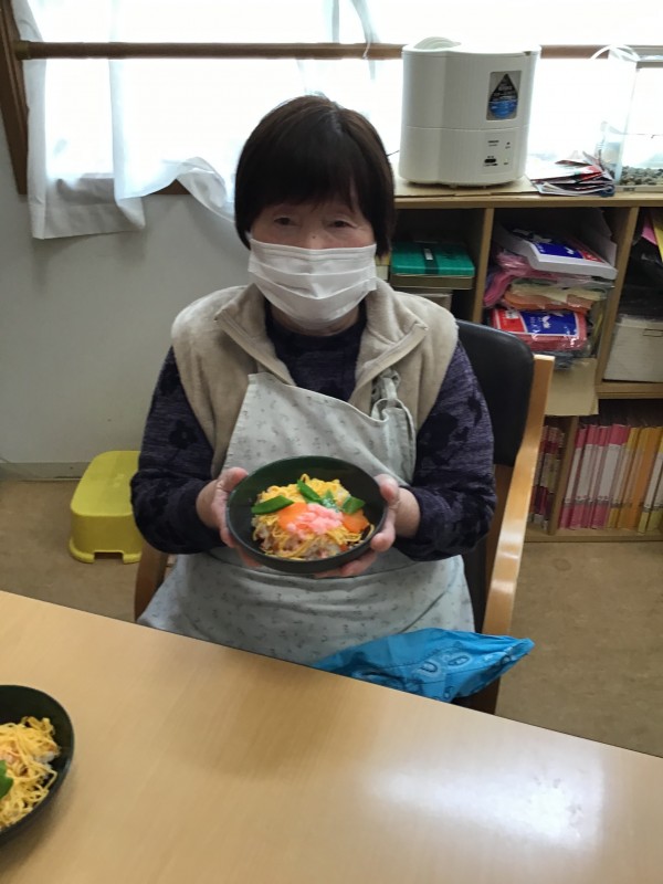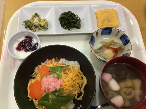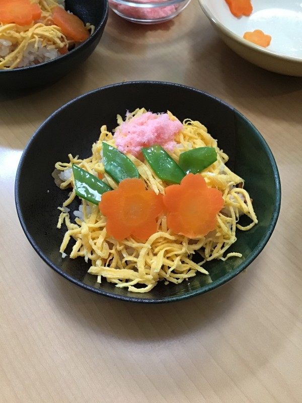 錦糸卵、絹さや、桜でんぶ、型抜きした人参を盛り付けていただきました(*^^*)