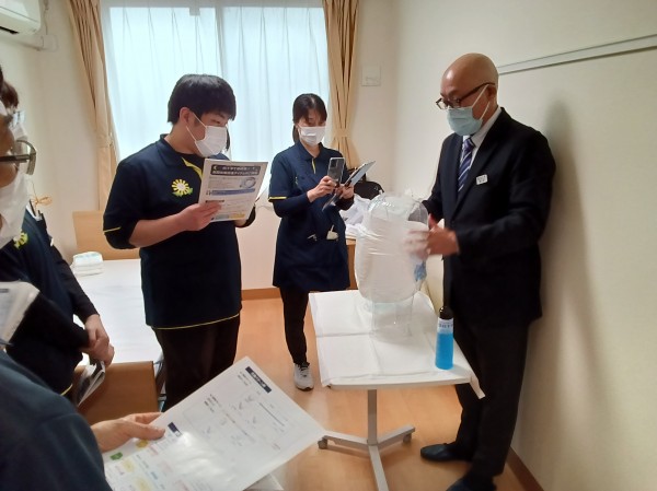 今在籍するご利用者様を想定しながら、オムツの正しい着用の仕方、ご利用者様の体型や尿量などに合わせた商品選びなどを学びました。