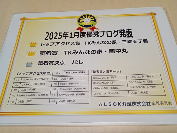 ★☆三橋6丁目のブログが『トップアクセス賞 』表彰‼1月度優秀ブログ発表2025年令和7年✨ 『みんなの家 三橋6丁目 介護ブログ』☆★