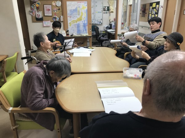 この時間に、他のご利用者様のご家族様が面会に来られ、お祝いの席に同席して下さり、職員のギター演奏による合唱にも賛同して下さいました(*^^)v(^^♪