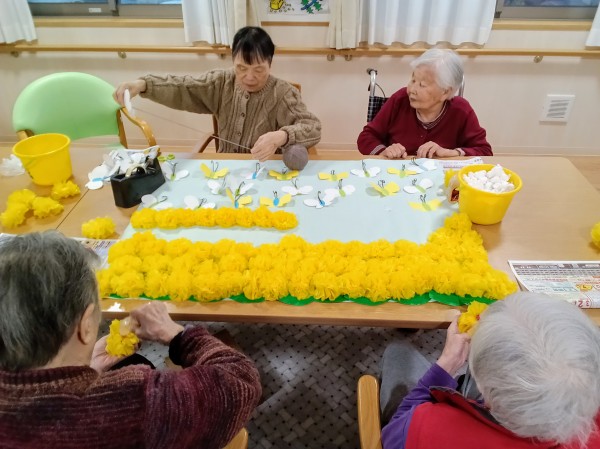 春の壁飾りとして2Uの皆さんが協力して作っている菜の花畑が出来上がりました\(^o^)/