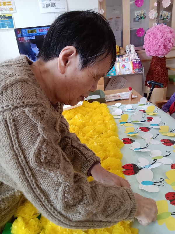 たくさんの菜の花、空には蝶々やてんとう虫も飛んでいて、春らしい壁飾りとなりました♪