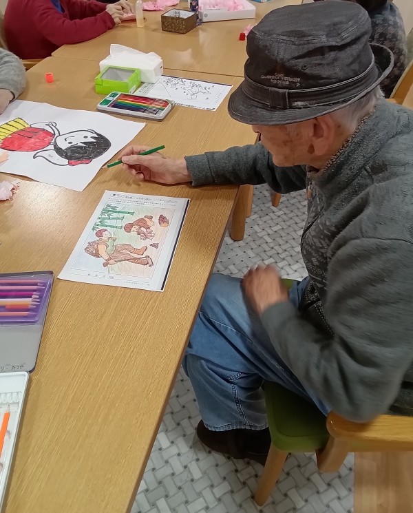 各フロアではレクの時間に時々季節のイラストのぬり絵をして楽しんでいただいております♪