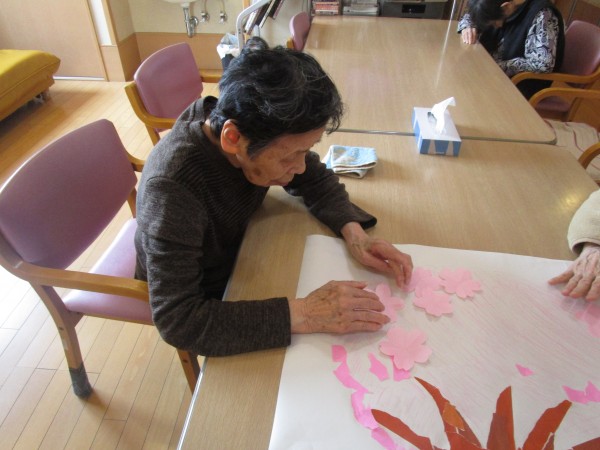 折り紙でちぎり絵をして、桜の花びらを貼っていきます。