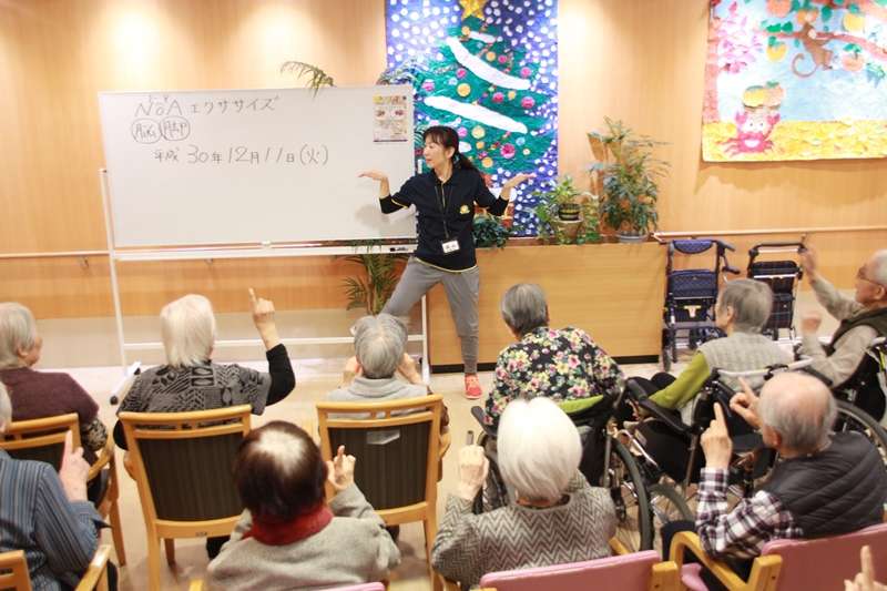 平成30年12月11日火曜日のNO~Aエクササイズ写真は、火曜日を体で表現しています。今年も12回のエクササイズが、大きな声と、大きな笑と、楽しくエクササイズを終えることができました。今回も施設の玄関ホールにて、デイサービス・ショートステイ・グループホームそして、すこや家のご利用者様が61名、他職員約10名の参加で元気よく腕を上げ足も上げたり下げたり約1時間笑顔で皆様参加されておりました。