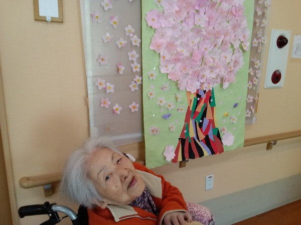桜の木の壁飾りに「さくら」の花びらを付けて満開になりました。
