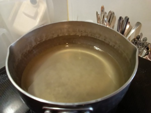 まずは水400ccに寒天8gを加え、そこへ更に砂糖130gを加えて1~2分ほど沸騰させます。