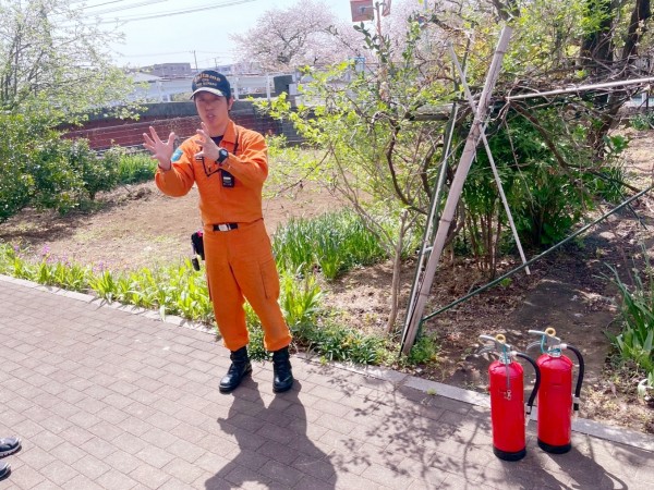 中央消防署の消防隊員さんから消火器の取り扱いについて説明を受けてから、水消火器で訓練を行ないました。