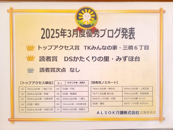 ★☆三橋6丁目のブログが『トップアクセス賞 』表彰‼3月度優秀ブログ発表2025年令和7年✨ 『みんなの家 三橋6丁目 介護ブログ』☆★