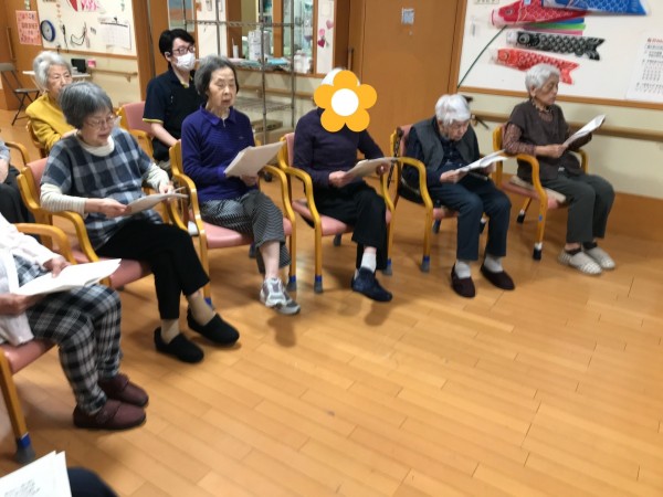 1階・2階のご利用者様が合同で集まり、歌詞カードを片手に全員で合唱。