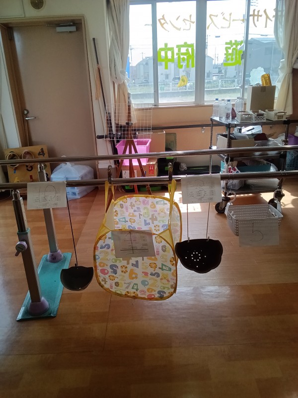 平行棒に色々入れ物をぶらさげて、そこにお手玉を投げ入れていきます。