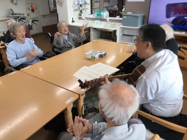 2階の食堂にいたご入居者様と童謡や小学校唱歌を楽しんで頂きました。