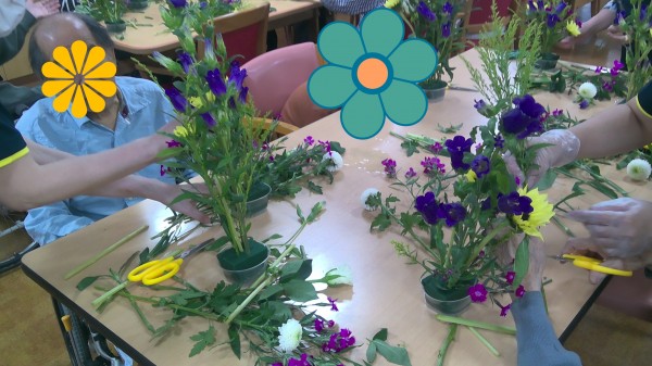 今回は、1Fデイサービスと合同のイベントフラワーアレンジメントを、行ないましたので