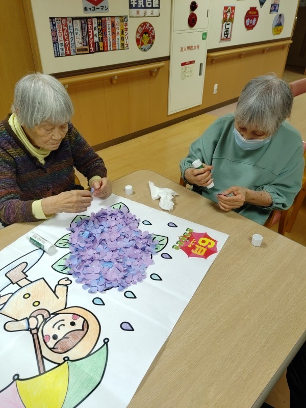 アジサイの絵に印刷した花びらを張り付けていただきました。
