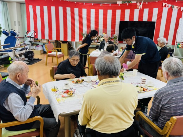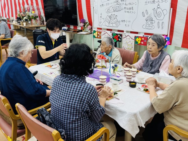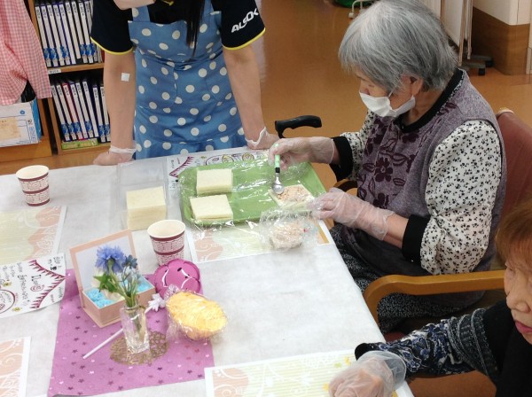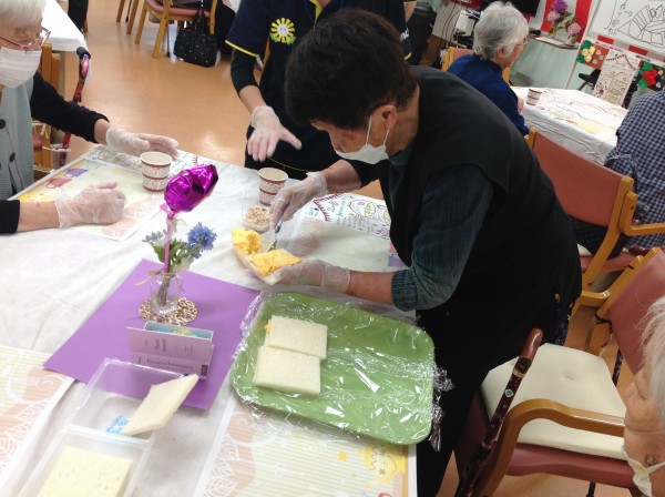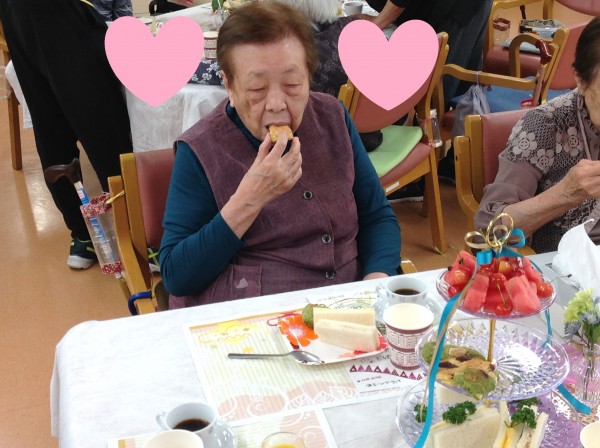 完成しましたー♪今回は季節のさくらんぼとスイカを追加してアフタヌーンティーを行いました。『初物75日』という言葉がありますが、初物を食べて寿命が75日伸びたわと喜ばれるご利用者様もいらっしゃいました。