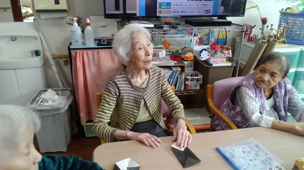 今日は折り紙で季節の飾りつけ作っている様子です(*´▽`*)