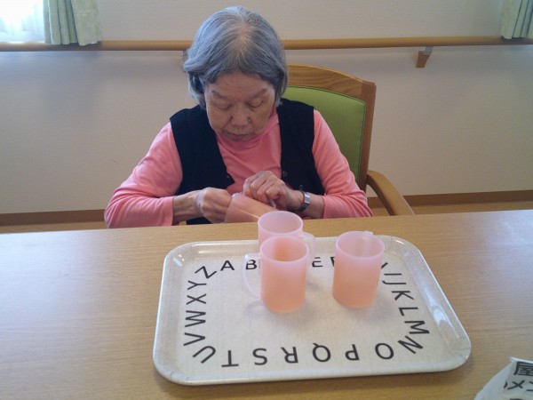 10時のお茶の食器のコップを自立支援で手先の運動を兼ねてお手伝いを