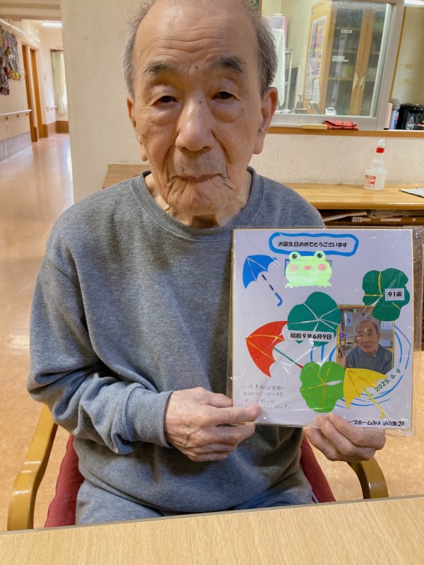 めでたく91歳の誕生日を迎えられたY様 まずはスタッフ手作りの色紙をお渡しして記念写真を撮りました。今日は俺の誕生日なの?あ~6月9日だ( ´∀` ) そうです!!これからお祝いしましょう(⌒∇⌒)