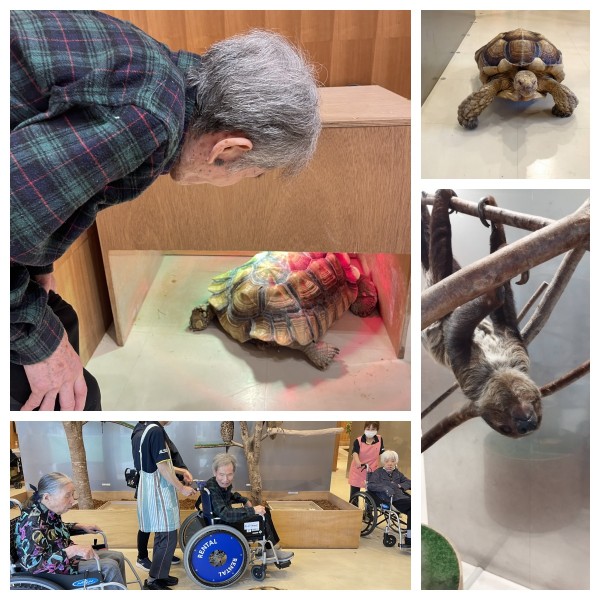 お店に入ると、まず目に飛び込んできたのは、大きなフクロウと、ゆっくり歩く陸ガメ、そしてなぜか天井からぶら下がるナマケモノ……!