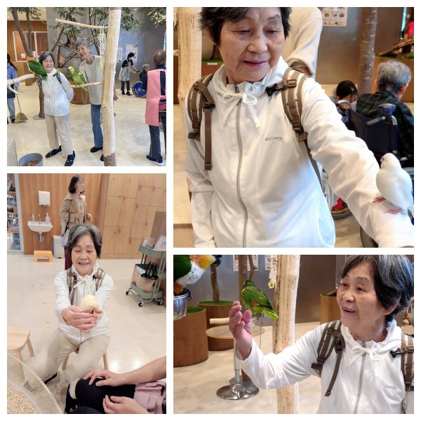 「ああ~インコが腕に乗ってくれたわ」と喜びの声が次々と。