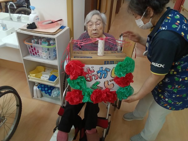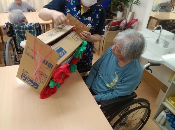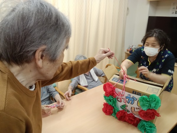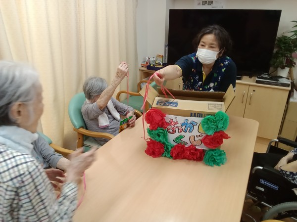 紐の先にお菓子(袋ごと)をつなぎ、ご利用者様に