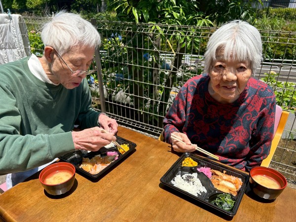 いい天気の中の外での食事、笑顔が輝いて見えますね(笑)