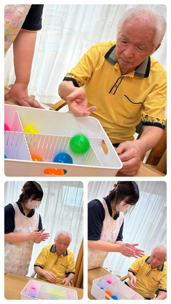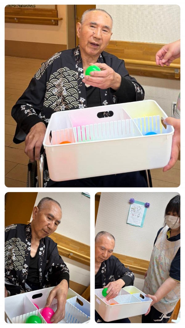 お次は・・カラフルなボールを使って座りながらも楽しめるボール投げを行いました!