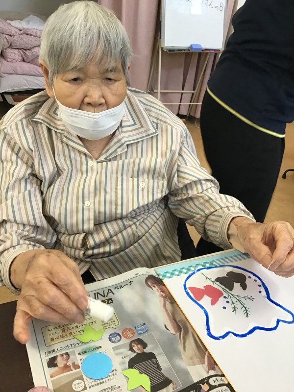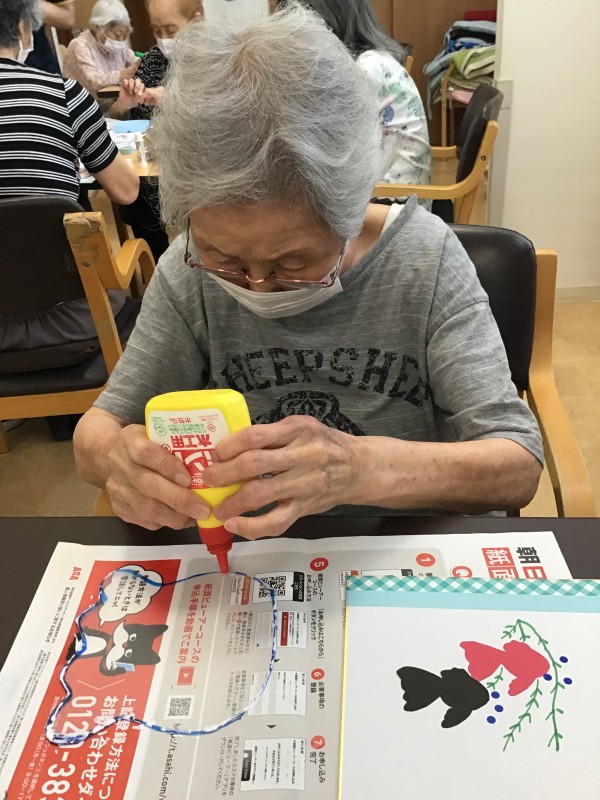 金魚鉢の中に金魚を泳がせてあげたら水草もご自身で書いていただいて金魚鉢をボンドで貼っていただきます。