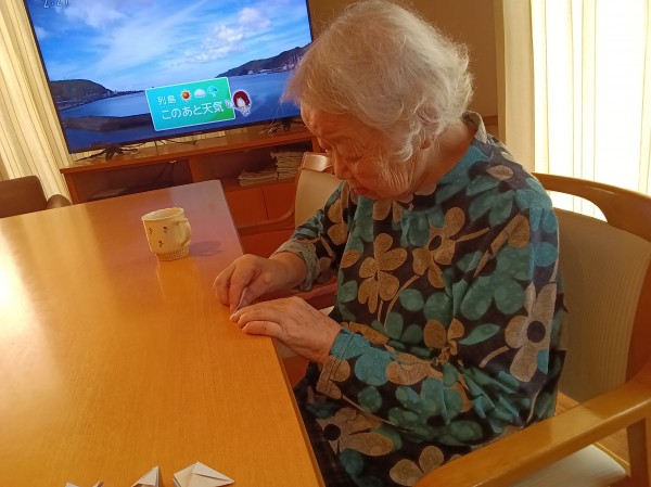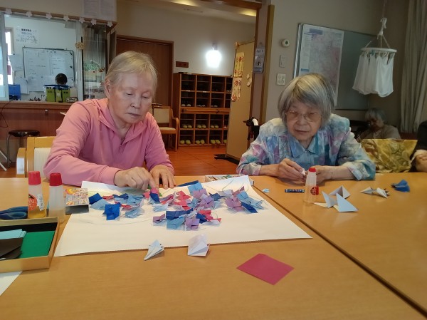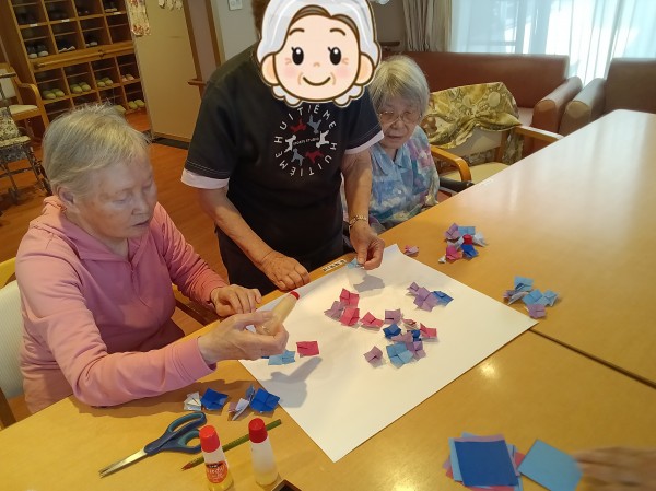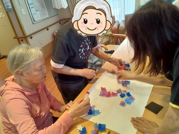 折り紙で、紫陽花の貼り絵を行いました( *´艸`)
