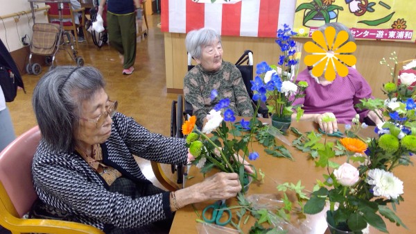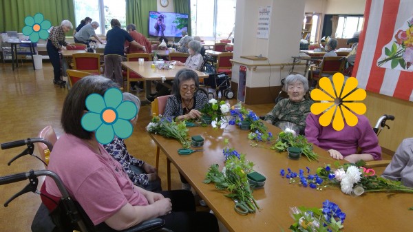 今回は、1Fデイサービスと合同でフラワーアレンジメントを行ないました。
