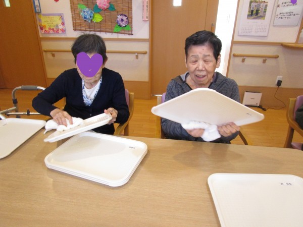 お盆を拭いて下さったり、山のような洗濯物をたたんで下さったりとスタッフは助かっています(*^^*)