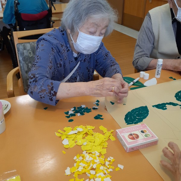 折り紙をちぎり、のり付けをして
