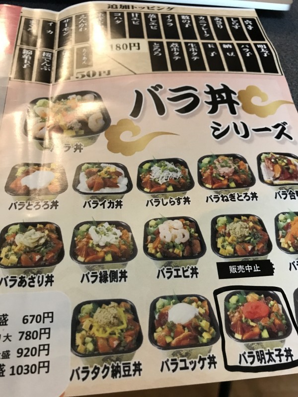 バラ丼、海鮮丼、ネギトロ丼、うな丼等など