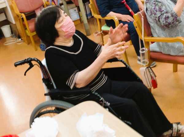 両手を広げ、手拍子しながら体の部位を叩いたり、体をぐいーーっと伸ばしたり、脚も上げ下げします!元気バリバリ!