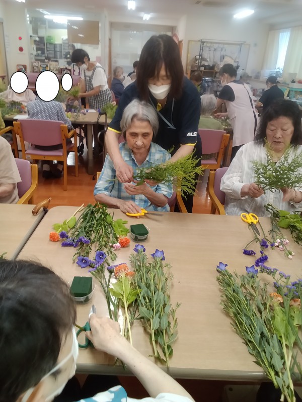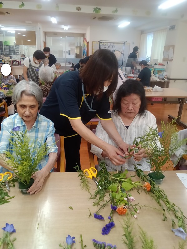 説明が終わったらお花を順番にオアシスに挿していきます。