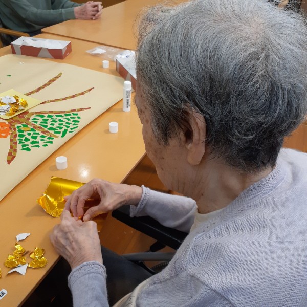 折り紙をちぎり、のり付けをして