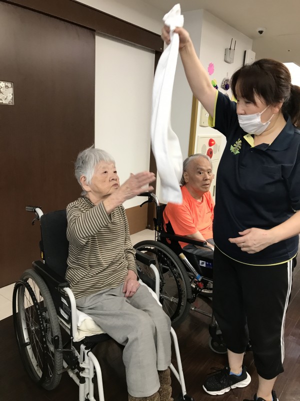 上からタオルを落として掴むゲームをしているところです。結構高い位置から落としても皆さんうまーくキャッチしていました。