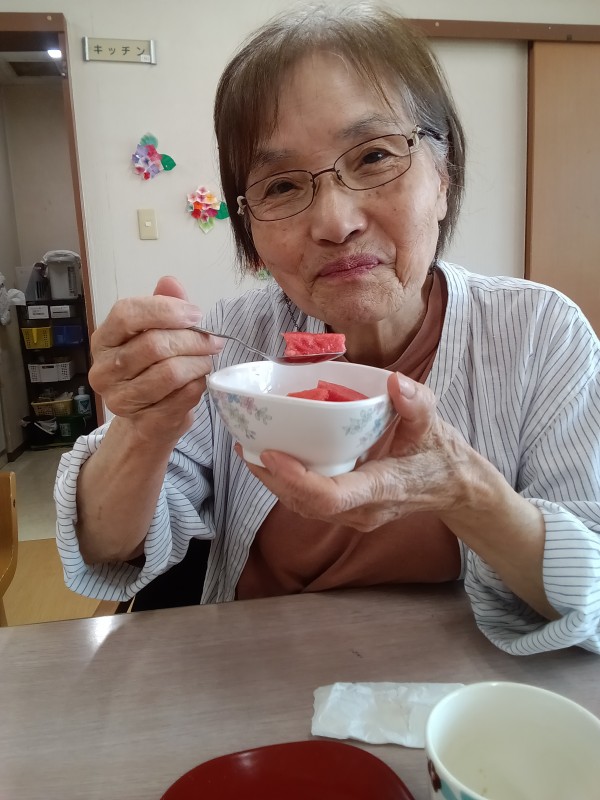 こんにちは。。。今回!またご家族様よりスイカを頂きました。ありがたいです。この異常気象のなか乗り越えていくには水分補給が大事で毎日同じような飲み物だた飽きてしまいますけど、たまに違うものが出てくるとすんなりと召し上がって頂けるので、スタッフとしては大変助かっています。