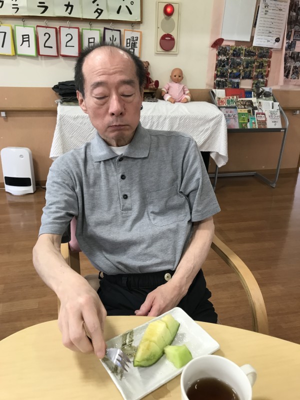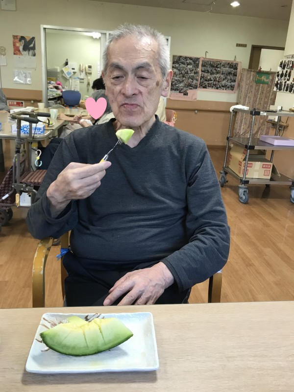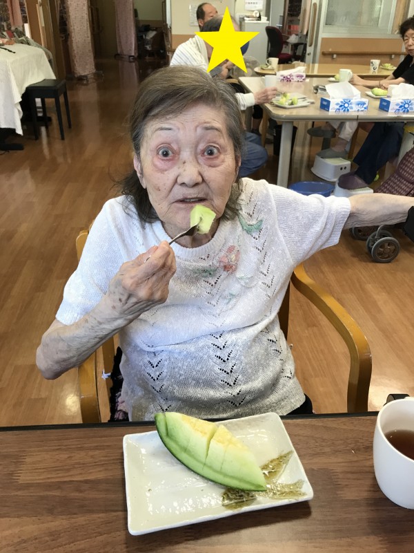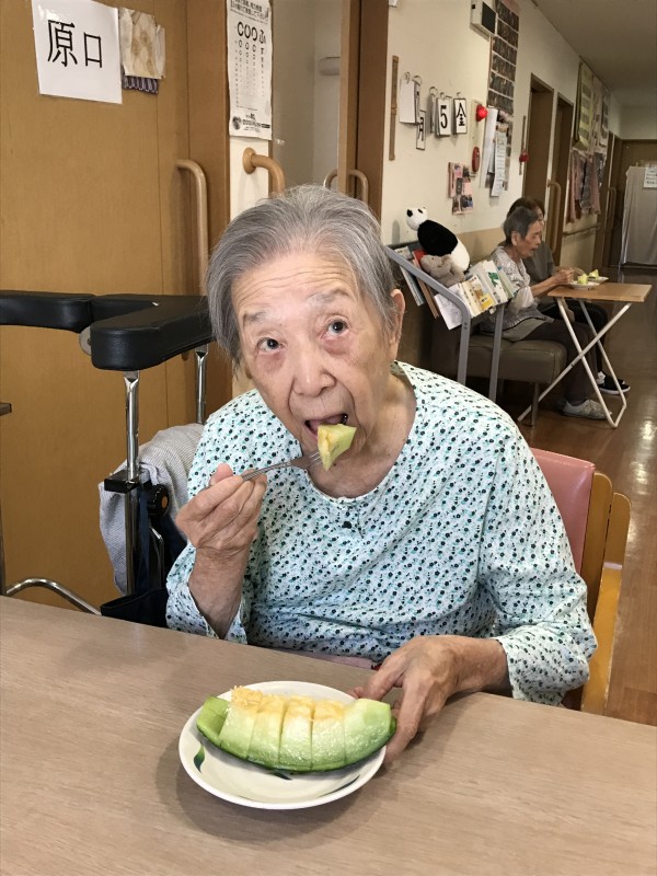 暑い夏日を乗り越えるため、甘味の溢れる果物のメロンを御利用者様方で召し上がられました。