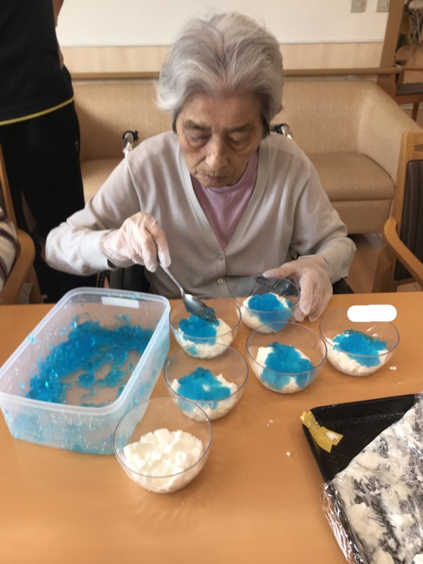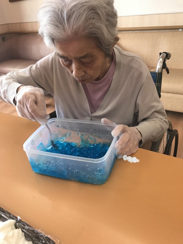 サイダーにかき氷シロップ(ブルーハワイ)で混ぜてゼラチンで固めてゼリーを作ります。