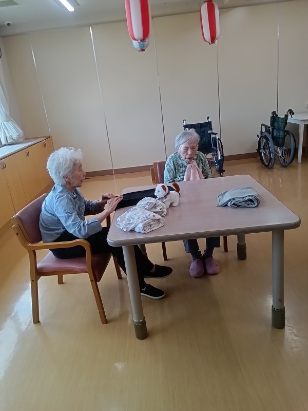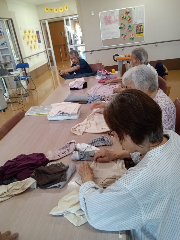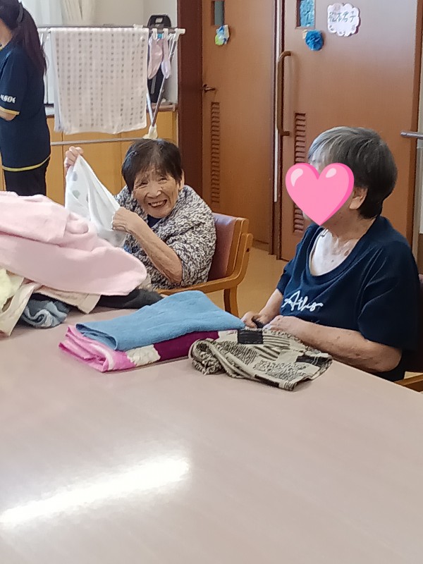 日々の様子ですが、入浴日の当日や翌日は洗濯物のたたみ物が多く、ご入居者様に生活リハビリとして参加して頂いていますが、やはり女性の方は