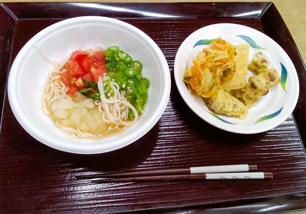 涼しい室内で、あったか素麺と天ぷら・トマト・オクラ・大根おろし・シソを入れて・・・ん~美味しそう(。-_-。)