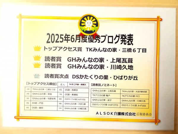 ★☆三橋6丁目のブログTopAccess『トップアクセス賞 』表彰‼6月度優秀ブログ発表‼2025年令和7年✨ 『みんなの家 三橋6丁目 介護ブログ』☆★