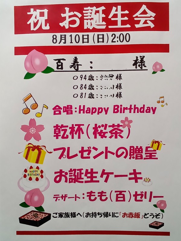 グループホームみんなの家・中野鷺宮で8月のお誕生の方が4名様いらっしゃいます。