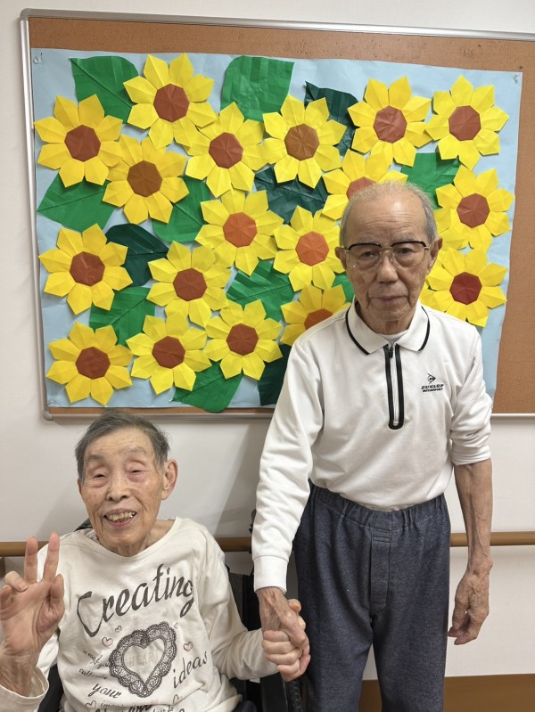 夏らしい『向日葵の壁面』の前で,笑顔でパシャリ♡