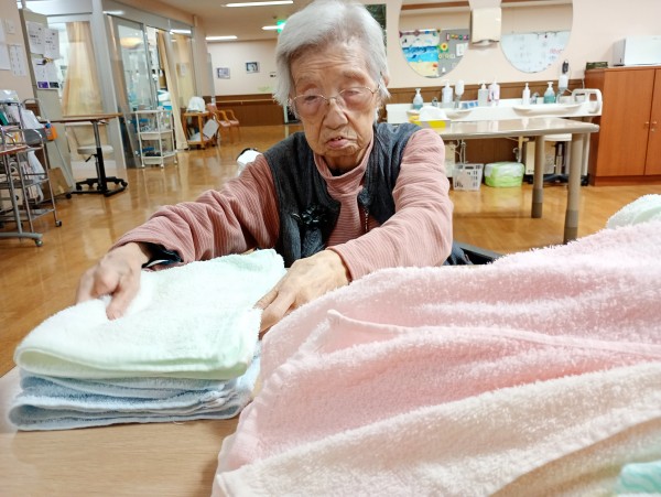今回のブログでは山積みタオルを畳むのを手伝ってくださるご利用者様の様子をお見せします♪♪