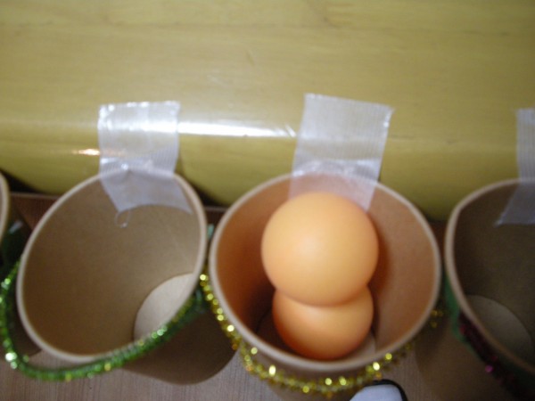 卵の空ケースを利用して左右にピンポン玉を移動させます(^^)/