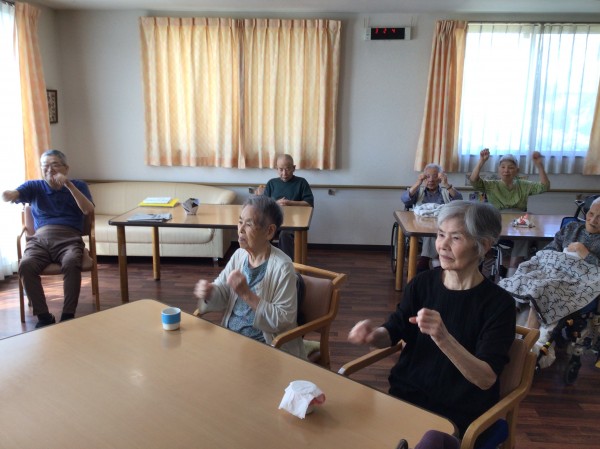 体操は毎朝10時に行っており、テレビに映る先生の動きに合わせ