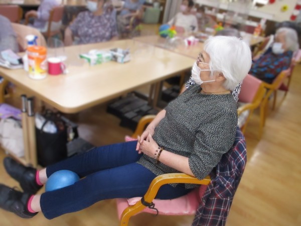 まずは準備運動で身体をほぐしてから、ボールやセラバンドを使ったトレーニングを行います。ボールを握ったり転がしたりすることで握力や手指の巧緻性(細かな動きを行う力)が自然と鍛えられます。また、ボールを足に挟んでの運動は、太ももの筋肉や体幹の安定にも効果的です。