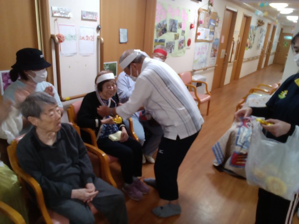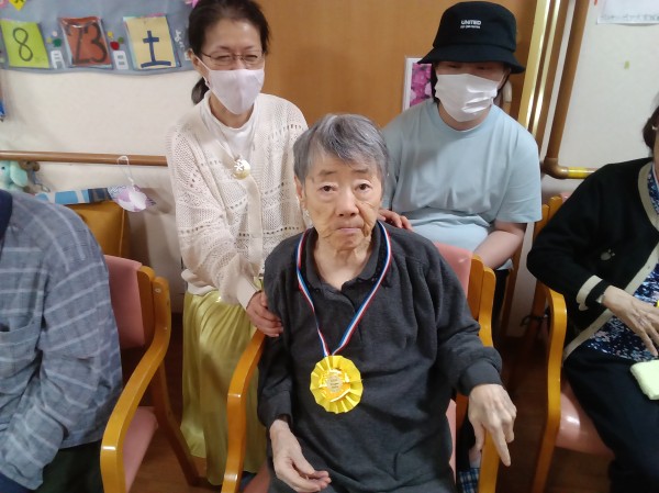 おひとりおひとりにお声をかけさせていただきながら、1階チームは地域の〇〇さん。2階チームはいきいきクラブ会長が金メダルを贈呈してくださいました。